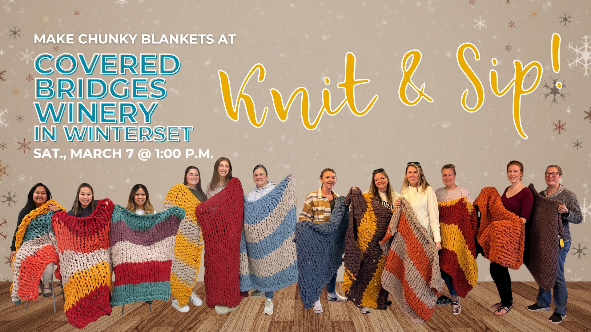 Join us for a “knit-and-sip” at Covered Bridges Winery in Winterset! Get cozy while you craft your own chunky knit blanket. We’ll provide step-by-step guidance and helpful instructions suitable for all skill levels. Blanket size will range from a lap throw to twin-sized, based on how tightly you choose to knit the yarn. The price includes 4 skeins of yarn in your choice of yarn colors (see below). Additional skeins can be purchased WHEN REGISTERING for $10/each.